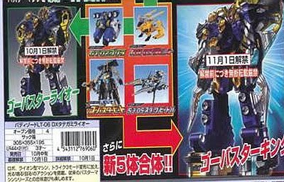 LT-06 Tategami Rai-Oh can transform to a lion, as its Animal Mode, and motorcycle (?) as its Vehicle Mode. It can combine with GT-02 Gorilla and RH-03 Rabbit to form Go-Buster RaiOh. Adding BC-04 Beetle and SJ-05 Stag Beetle in the equation will form Go-BusterKing!